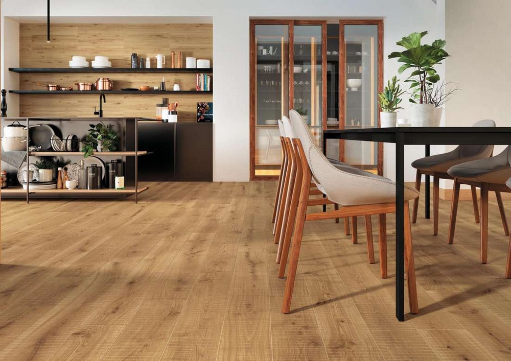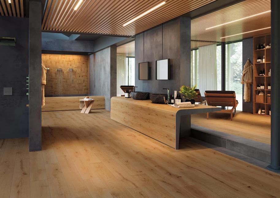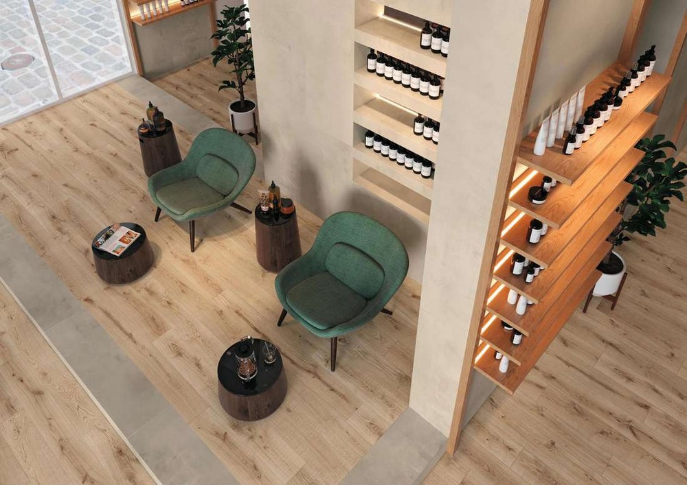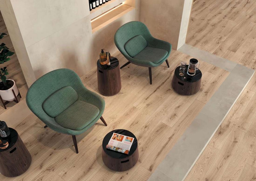 Плитка Exence отлично смотрится в качестве напольного покрытия, однако многие дизайнеры используют ее и для отделки стен. Правильно распорядившись предлагаемыми оттенками, умело комбинируя их, можно создавать подлинные дизайнерские шедевры. Во многом стиль задает и покрытие керамогранита, которое предложено в структурированном и матовом вариантах. Размерная линейка невелика, в ней всего два формата – 18,5x150 и 20x120 см. Материал выполнен в виде удлиненных керамических досок, которые придают керамограниту Exence еще больше сходства с деревянными досками. А идеальная обработка кромок помогает создать иллюзию цельного керамогранитного блока, поскольку при монтаже такой плитки швы между отдельными пластинами заметны незначительно.