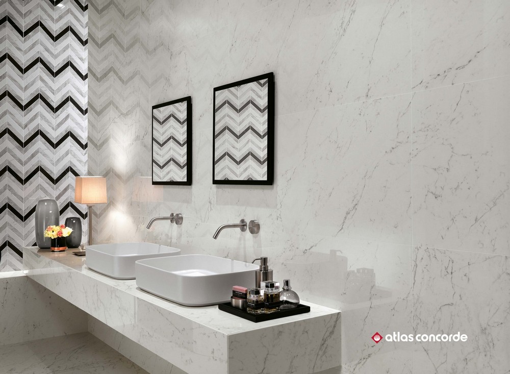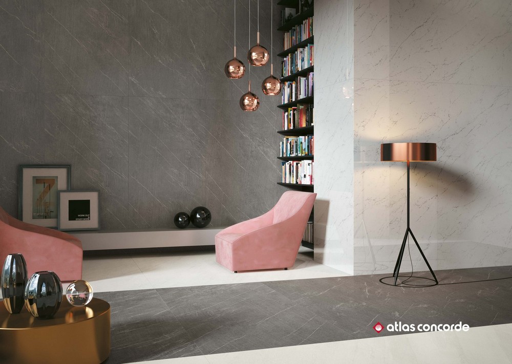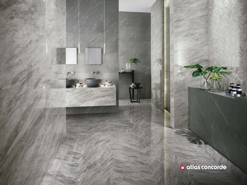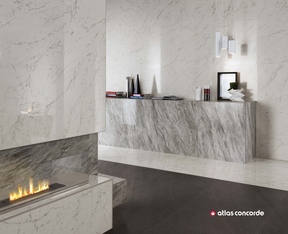 Производитель предлагает отделочные материалы для стен и пола с фактурой нескольких видов мрамора и натурального камня из коллекции Atlas Concorde Marvel Stone (Атлас Конкорд Марвел Стоун). Присущая мрамору красота, а также все цветовые переходы, тонкие прожилки и трещины были запечатлены производителем в мельчайших деталях. Их великолепная текстура создает фантастическое полотно для творчества. Для отделки стен выпускаются керамические плиты двух размеров: 40×80 см и 50×110 см. Слэбы с мраморной текстурой имеют глянцевую поверхность, а материал с каменной текстурой – матовую. Для стен предлагается множество художественных составляющих: классическая мозаика с ослепительной крошкой, мозаика в виде «косички», паркет, каменная кладка. Объемные декоры с геометрическими 3D-фигурами придадут интерьеру неповторимый шарм и фантастическую динамику. Цветокор коллекции представлен светлыми и темными оттенками. Глянцевый «мрамор» выполнен в расцветках: белоснежный (Carrara Pure), серый (Bardiglio Grey), насыщенно черный (Nero Marquina), светло-серый (Bianco Dolomite). Для отделки под камень были выбраны следующие цвета: белая глазурь (Clauzetto White), крем-брюле (Desert Beige), элегантный тёмный (Cardoso Elegant), сливочный шик (Cream Prestige). Керамогранит для напольного покрытия среднего и крупного формата с матовой и полуматовой поверхностью выпускается в следующих форматах: 30×60 см, 45×90 см, 60×60 см, 60×120 см, 75×75 см, 75×150 см, 120×120 см, 120×240 см. Существует несколько видов структурированного керамогранита, предназначенного для общественных мест, влажных помещений, балконов или отделки открытых площадок с размерами плит 30×60 см и 60×120 см. Цветокор керамического гранитного пола аналогичен коллекции цветов настенной плитки, в частности добавлен еще один оттенок природного камня - Basaltina volcano.