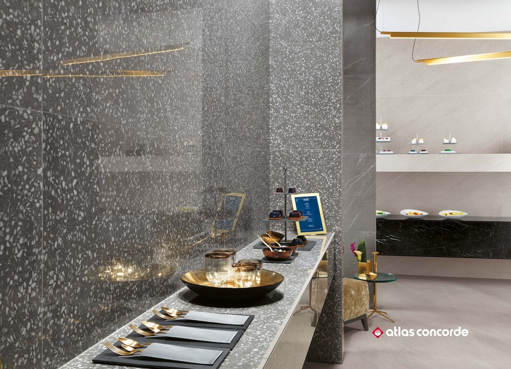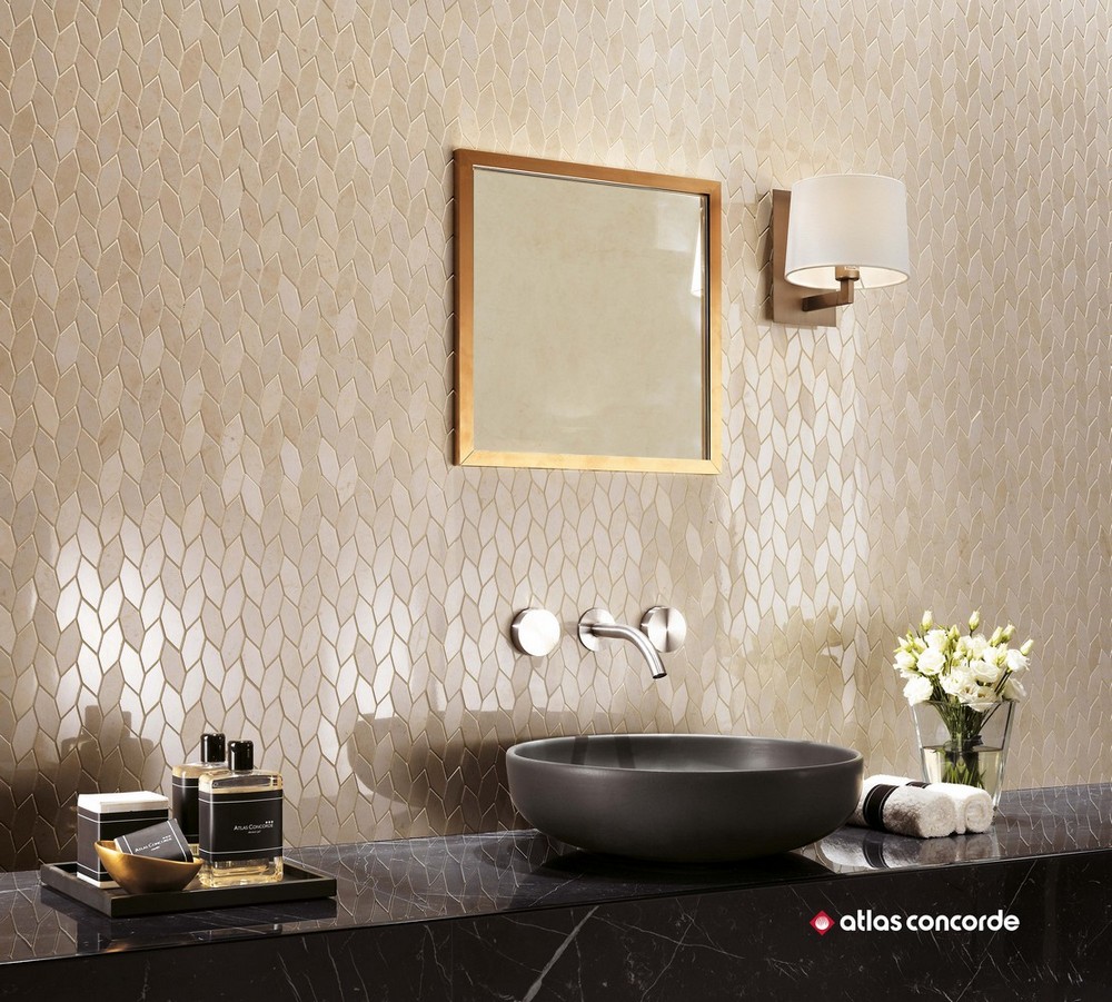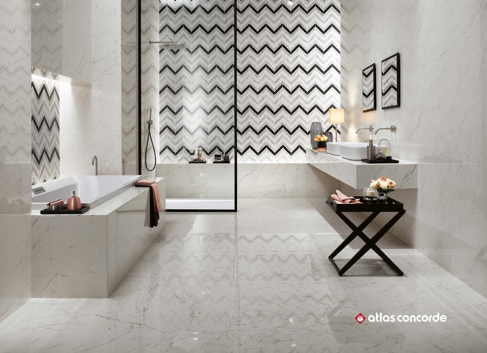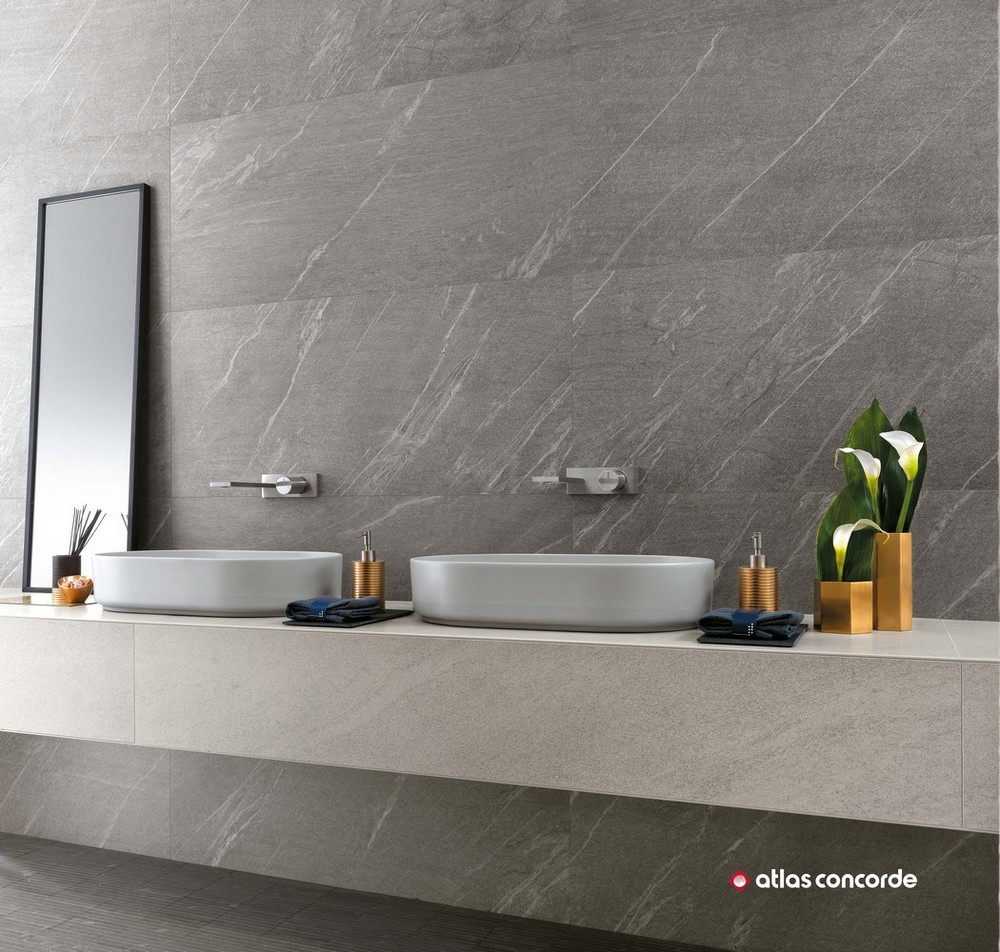 Производитель предлагает отделочные материалы для стен и пола с фактурой нескольких видов мрамора и натурального камня из коллекции Atlas Concorde Marvel Stone (Атлас Конкорд Марвел Стоун). Присущая мрамору красота, а также все цветовые переходы, тонкие прожилки и трещины были запечатлены производителем в мельчайших деталях. Их великолепная текстура создает фантастическое полотно для творчества. Для отделки стен выпускаются керамические плиты двух размеров: 40×80 см и 50×110 см. Слэбы с мраморной текстурой имеют глянцевую поверхность, а материал с каменной текстурой – матовую. Для стен предлагается множество художественных составляющих: классическая мозаика с ослепительной крошкой, мозаика в виде «косички», паркет, каменная кладка. Объемные декоры с геометрическими 3D-фигурами придадут интерьеру неповторимый шарм и фантастическую динамику. Цветокор коллекции представлен светлыми и темными оттенками. Глянцевый «мрамор» выполнен в расцветках: белоснежный (Carrara Pure), серый (Bardiglio Grey), насыщенно черный (Nero Marquina), светло-серый (Bianco Dolomite). Для отделки под камень были выбраны следующие цвета: белая глазурь (Clauzetto White), крем-брюле (Desert Beige), элегантный тёмный (Cardoso Elegant), сливочный шик (Cream Prestige). Керамогранит для напольного покрытия среднего и крупного формата с матовой и полуматовой поверхностью выпускается в следующих форматах: 30×60 см, 45×90 см, 60×60 см, 60×120 см, 75×75 см, 75×150 см, 120×120 см, 120×240 см. Существует несколько видов структурированного керамогранита, предназначенного для общественных мест, влажных помещений, балконов или отделки открытых площадок с размерами плит 30×60 см и 60×120 см. Цветокор керамического гранитного пола аналогичен коллекции цветов настенной плитки, в частности добавлен еще один оттенок природного камня - Basaltina volcano.